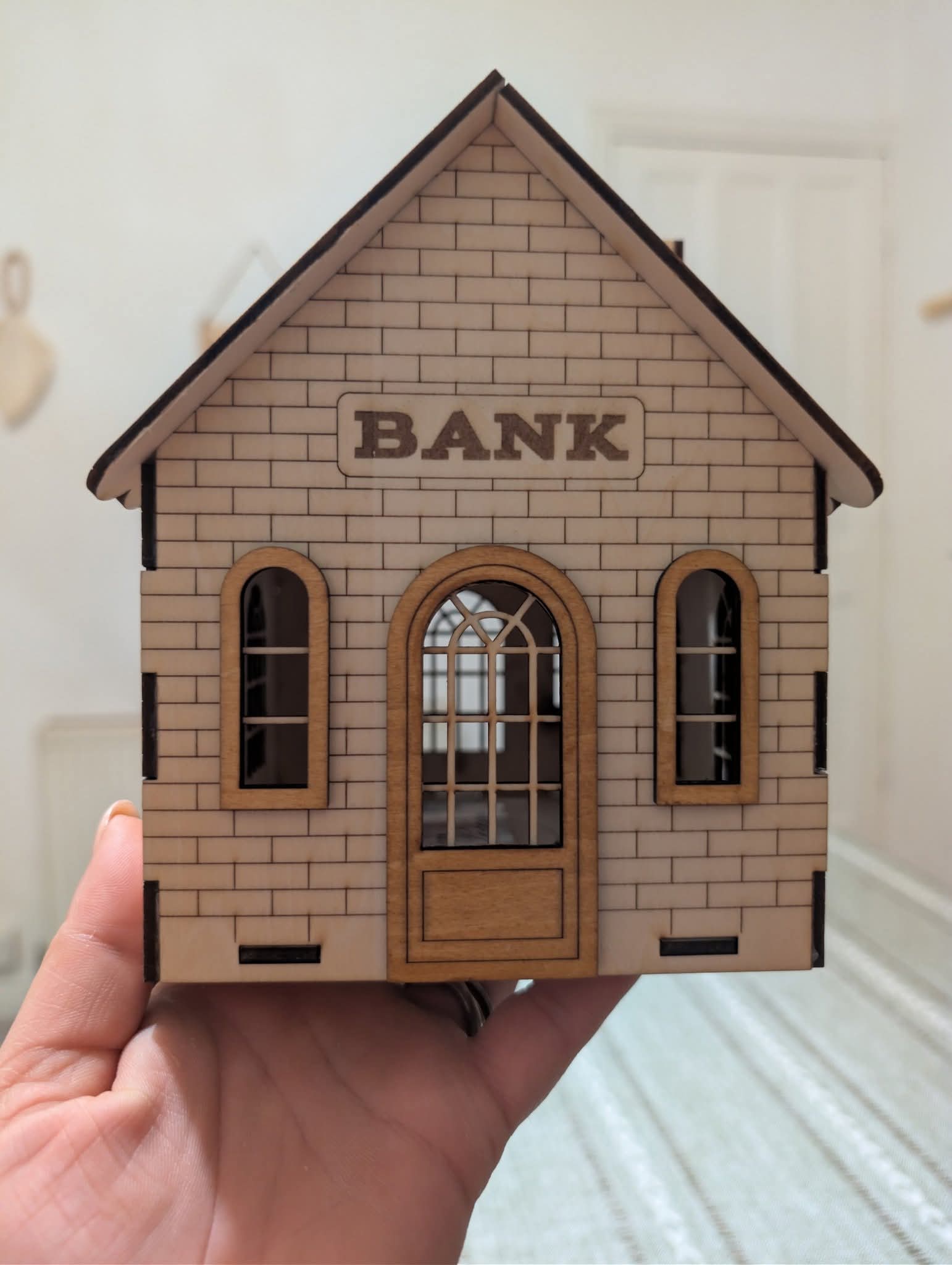 A beautifully crafted wooden money box in the shape of a vintage bank building. Made from high-quality 3mm plywood and precisely cut with a laser for a detailed finish. The box opens from the bottom for easy access to your savings. Perfect as a gift or home decoration!